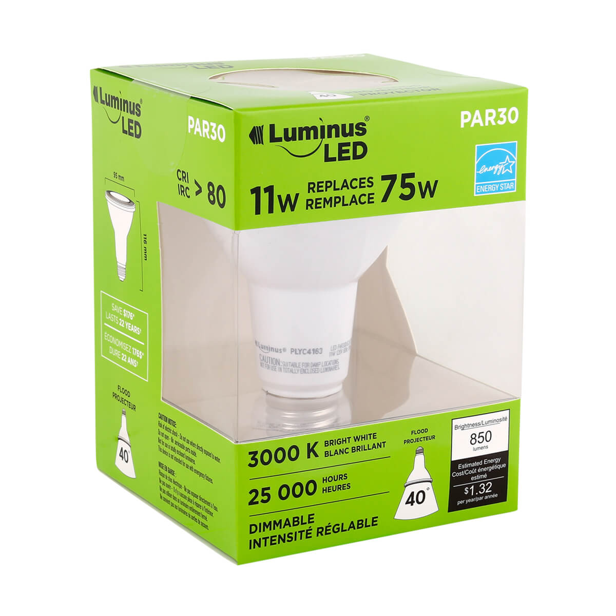 This PAR30 LED bulb by Luminus allows you to save energy; using only 11 W, it offers the same intensity as a conventional 75 W light bulb. It emits a dimmable bright white light, produces a brightness of 850 lumens, and has a color temperature of 3,000 K.